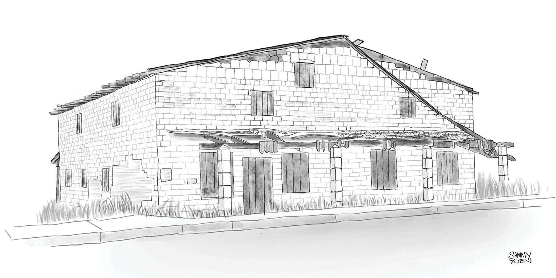 This drawing depicts the only surviving remnant of a once-thriving Chinatown in Rancho Cucamonga, CA—a two-story, circa 1919 group housing and store building that served Chinese workers. Designated as a city landmark, the China House stands as a poignant reminder of a forgotten chapter in history: the rural Chinatowns that supported many agriculturally based communities in Southern California through Chinese labor.