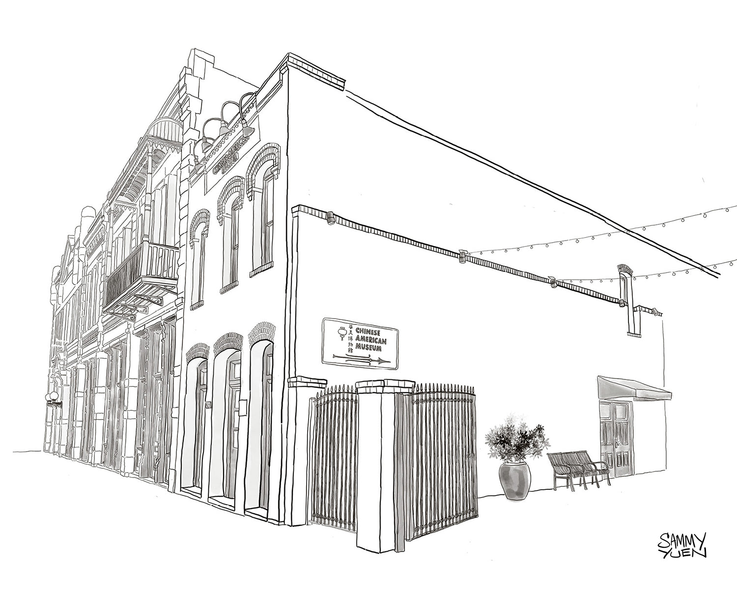 Drawing of the Chinese American Museum Los Angeles (CAMLA). Established in 2003, CAMLA is housed in the historic Garnier Building—one of the last remaining structures from Old Chinatown, which was largely demolished between 1933 and 1938 to make way for Union Station. CAMLA is dedicated to researching, preserving, and sharing the experiences and contributions of Chinese Americans in the United States through exhibitions, programs, events, publications, and workshops.