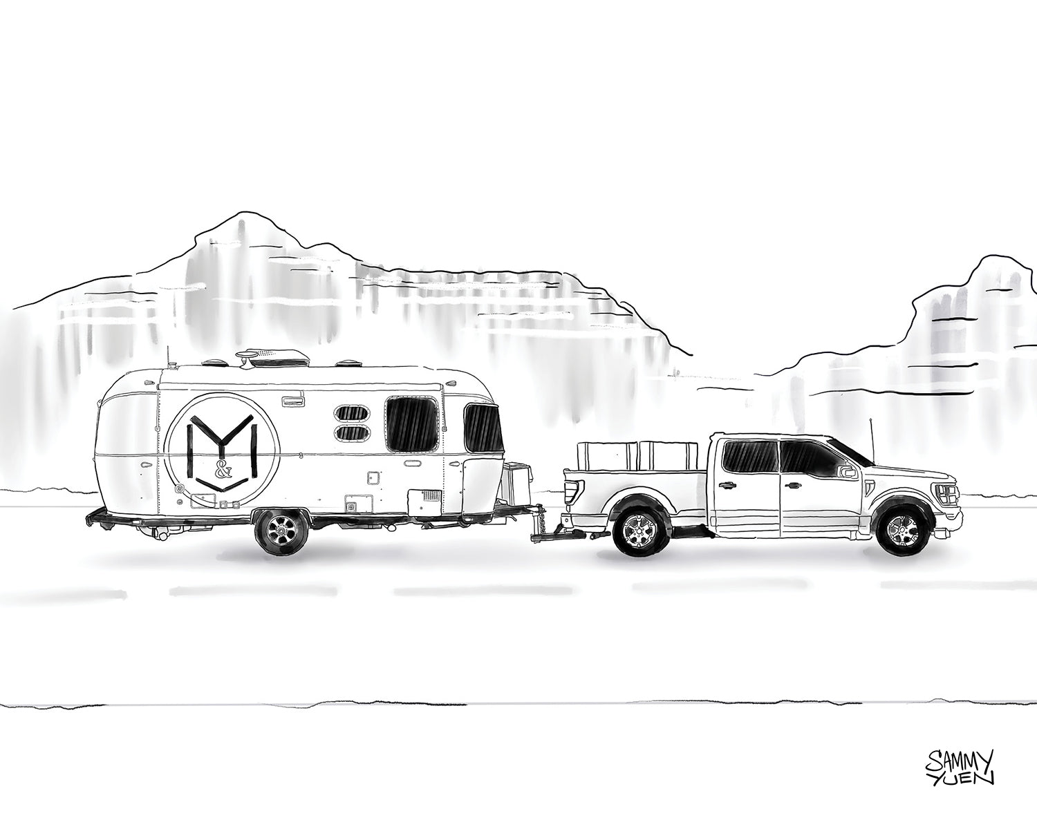Drawing of a conceptual mobile bookstore on a travelling book tour driving to Amarrillo Texas. Amarrillo is the second fastest growing midsize city in America and has a 5.9% Asian population. The goal of the mobile book tour would be to elevate underrepresented Asian American authors and stories along Route 66. The artist, in partnership with Yu and Me Bookstore out of New York City, the first Asian American and woman owned bookstore in Manhattan, is in the process of envisioning a mobile bookstore concept to celebrate the Route 66 centennial.